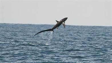 Thresher sharks are the showstoppers out here. These acrobatic predators are known for their incredibly long, whip-like tails that they use to stun their prey. They'll often go airborne when hooked, putting on a spectacular show. Threshers typically range from 200-400 pounds, but we've seen some pushing 500+. They're most active in our waters from late spring through fall.
